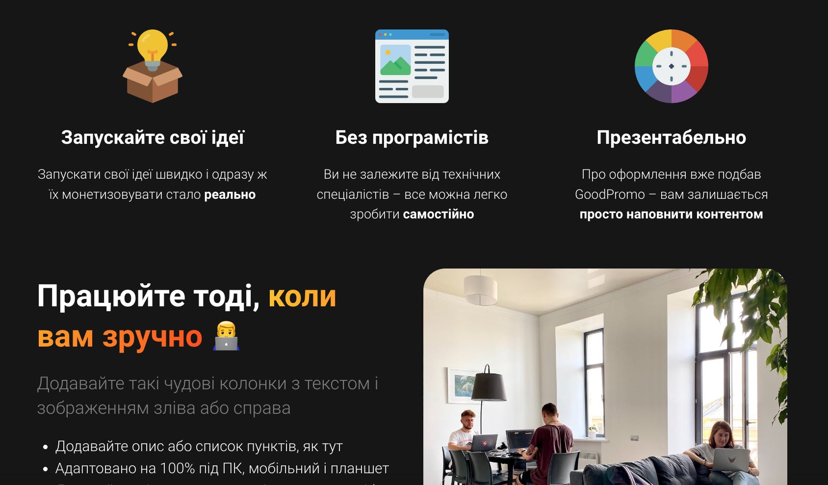 Весь цей лендінг зі всіма блоками, текстами, зображеннями які ви бачите зроблений без коду, ви можете легко створити такий лендінг і навіть краще для свого проєкту, без програмістів за хвилини, а не за тижні й місяці